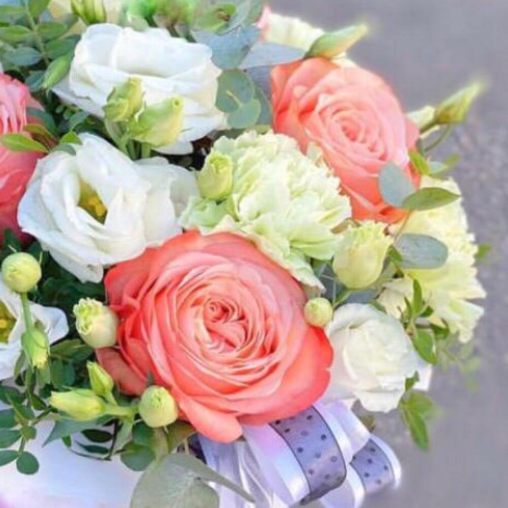 Альстромерии, Гвоздики, Кустовые розы, Лизиантусы, Розы, Хризантемы