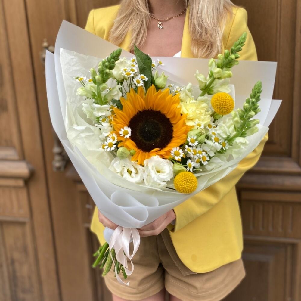 Солнечный яркий букет, выполненный из подсолнуха, лизиантуса, маттиолы и краспедии.Такой букет точно понравится яркой и энергичной получательнице, и будет долго радовать её.К букету прилагается открытка с вашими пожеланиями, инструкцию по уходу за цветами и приятный комплимент от нашего магазина – шоколадка.Мы также будем рады отправить вместе с букетом конфеты, шоколад ручной работы или б/а вино по вашим пожеланиям, просто напишите нам в личные сообщения. Заказывая наш букет, Вы всегда получите исключительный сервис и заботу о клиенте