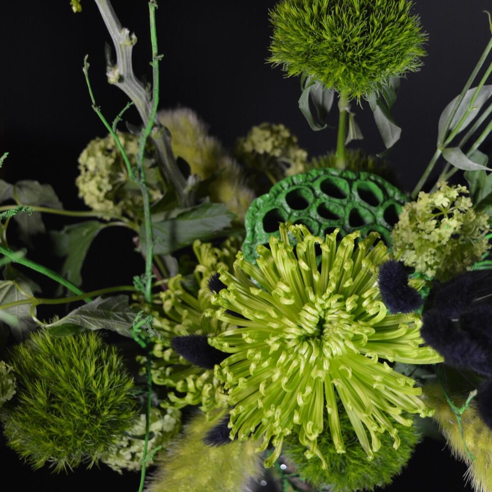 Хризантема – 4 шт.Гвоздика – 4 шт.Вибурнум – 2 шт.Сетария – 3 шт.ветки декоративные – 2 шт.Лагурус – 7 шт.Лотос – 1 шт.