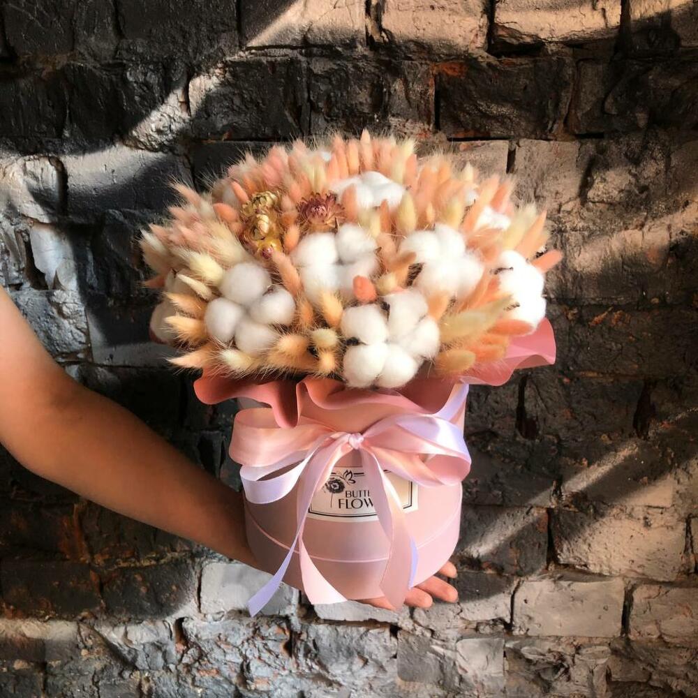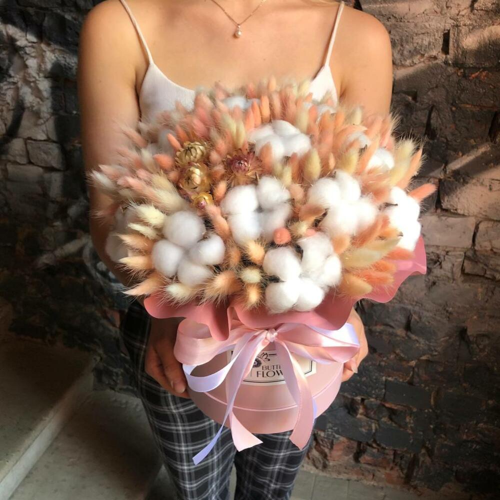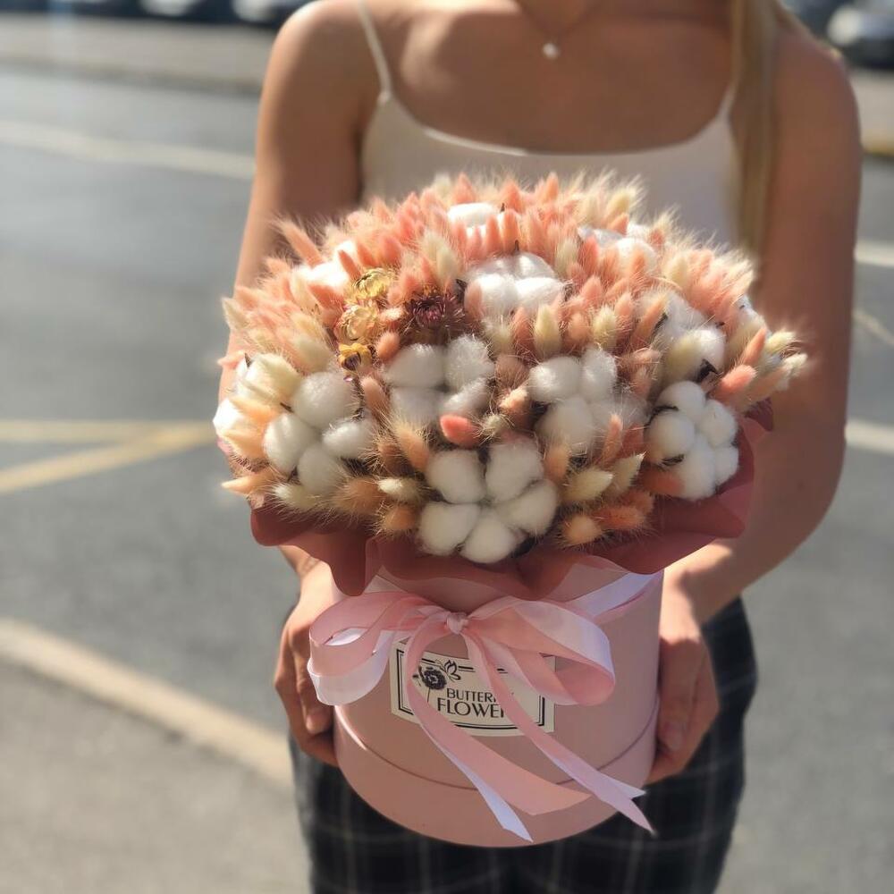 Букет из сухоцветов – лагуруса, хлопка и стабилизированной розы в шляпной коробке «Ирма»