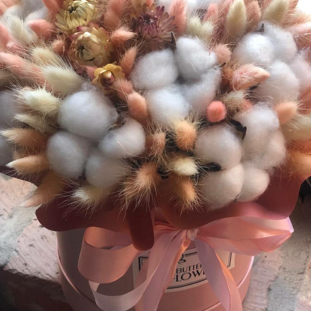 Букет из сухоцветов - лагуруса, хлопка и стабилизированной розы в шляпной коробке «Ирма»
