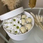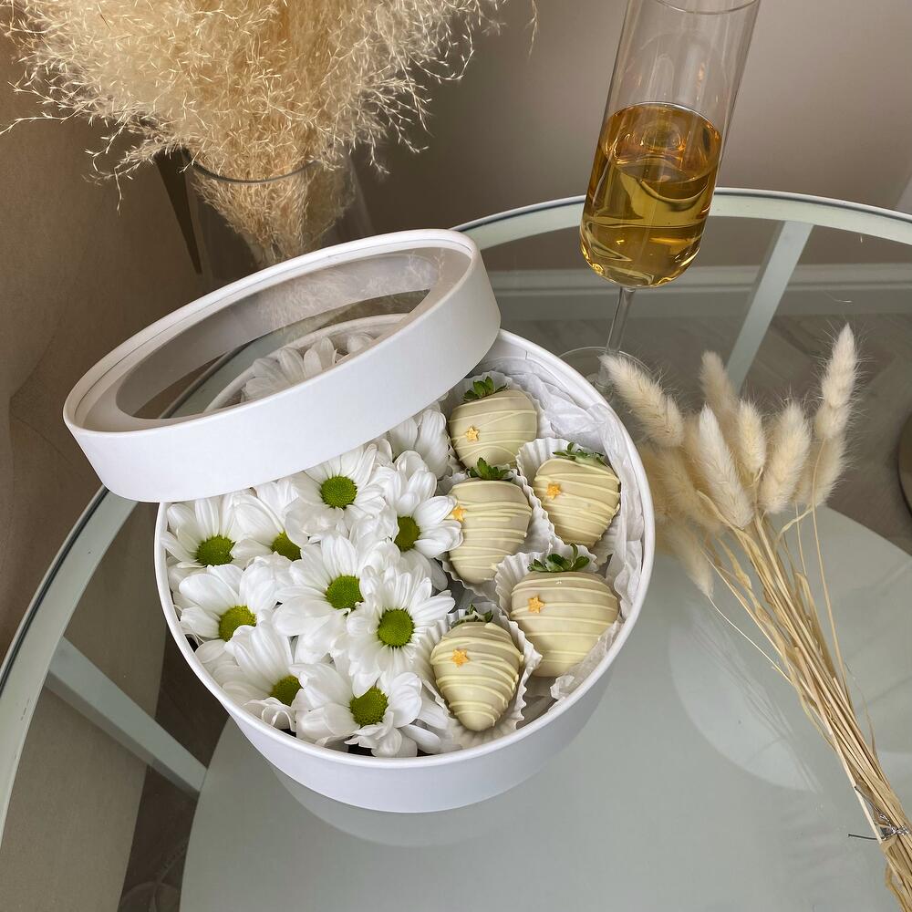 Милейший подарочный набор в круглой коробке с прозрачной крышкой, Хризантема и клубника в белом шоколаде, идеальный подарок, который никого не оставит равнодушным!Срок хранения клубники 24 часа при температуре от +2 до +8