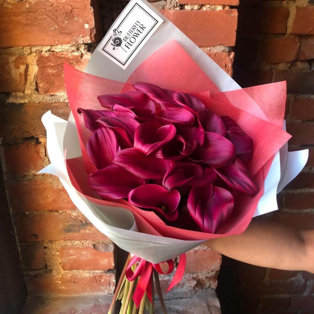 Букет из 21 бордовой каллы в стильной упаковке “Минна”