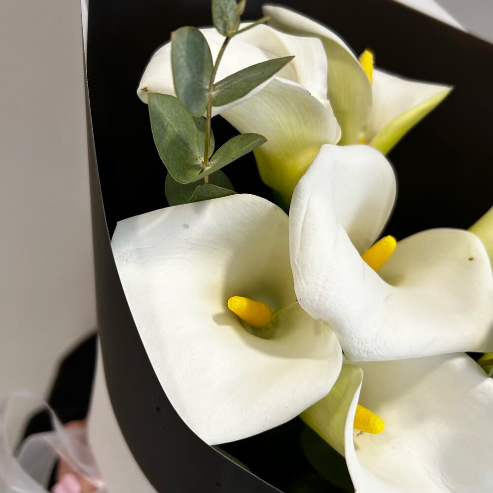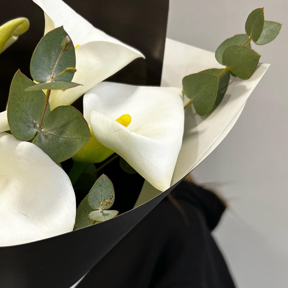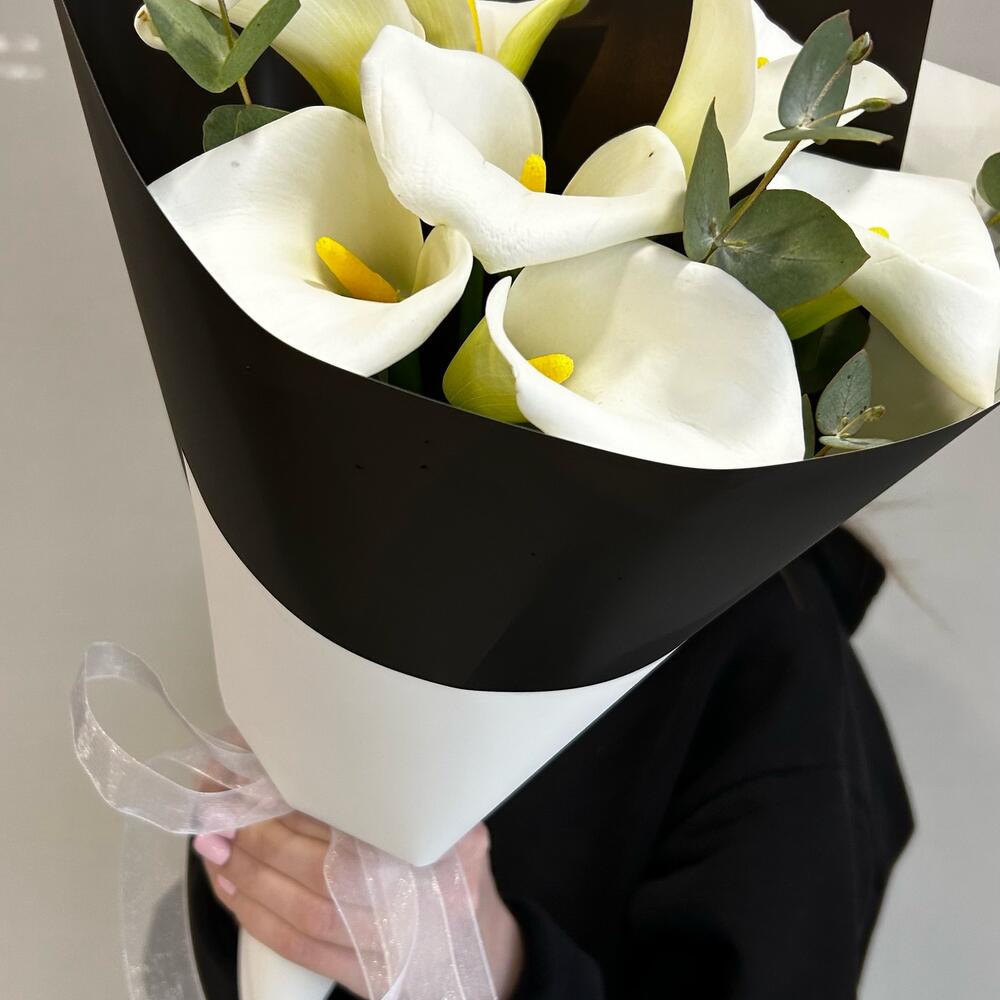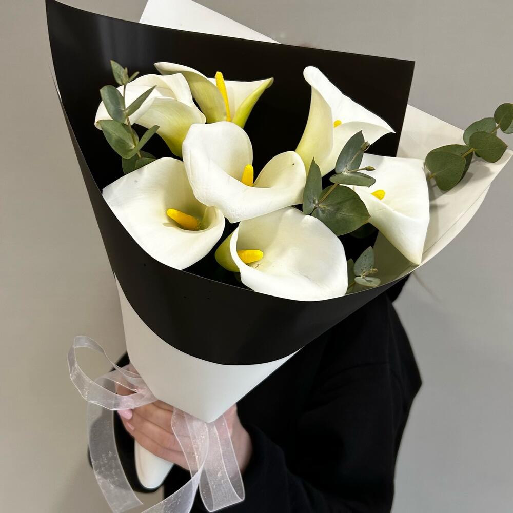 Калла – 7 шт.Лента – 1 шт.Эвкалипт – 1 шт.Упаковка дизайнерская – 2 шт.