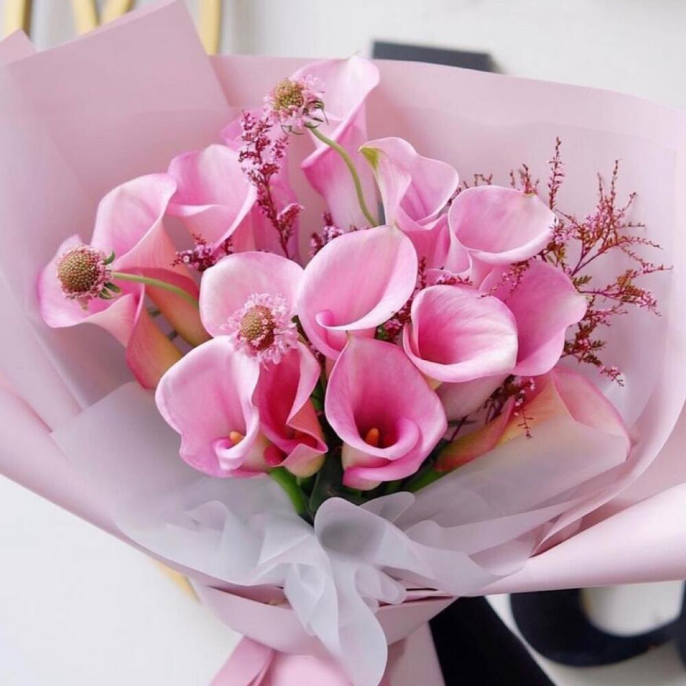 Калла розовая – 13 шт.декоративная зелень – 10 шт.Упаковка дизайнерская – 2 шт.Лента атласная – 2 шт.Открыточка с вашими пожеланиями – 1 шт.хорошее настроение – 100 шт.инструкция по уходу за цветами – 1 шт.коробка переноска – 1 шт.Кризал – 1 шт.