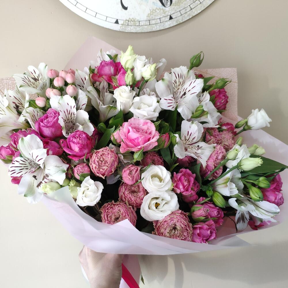Альстромерия – 10 шт.Роза кустовая – 7 шт.Хиперикум – 3 шт.пионовидные розы – 5 шт.