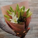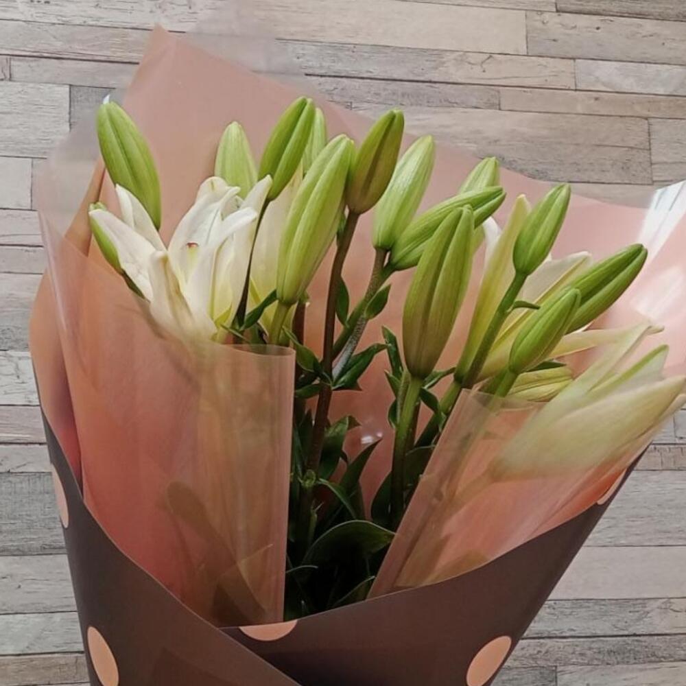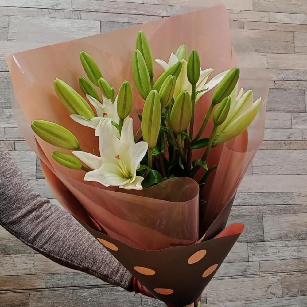 Лента атласная – 2 шт.Упаковка дизайнерская – 2 шт.Лилия Азиатская белая – 5 шт.