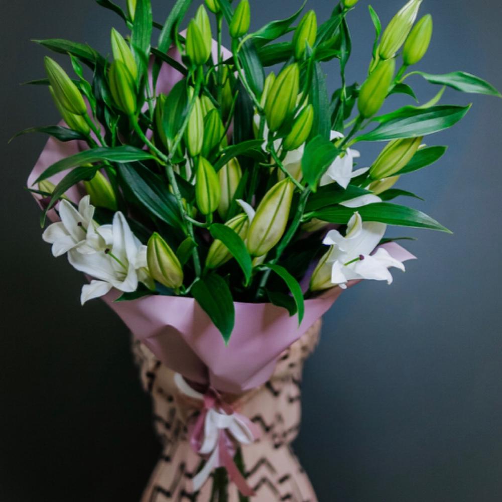 лилии – 5 шт.дизайнерская упаковка и атласная лента – 1 шт.