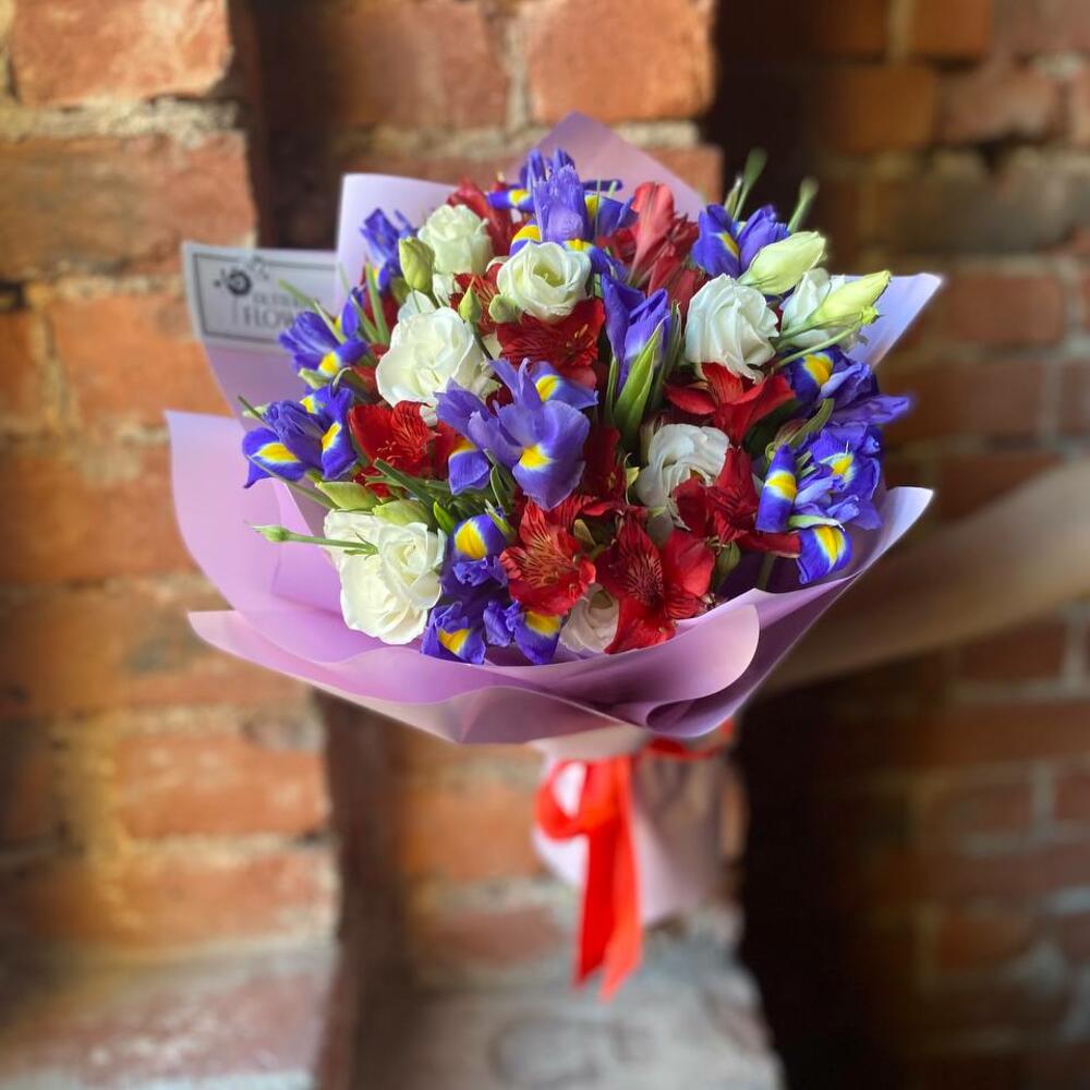 Букет из альстромерии, эустомы и ирисов в стильной упаковке “Ситцевый платочек”