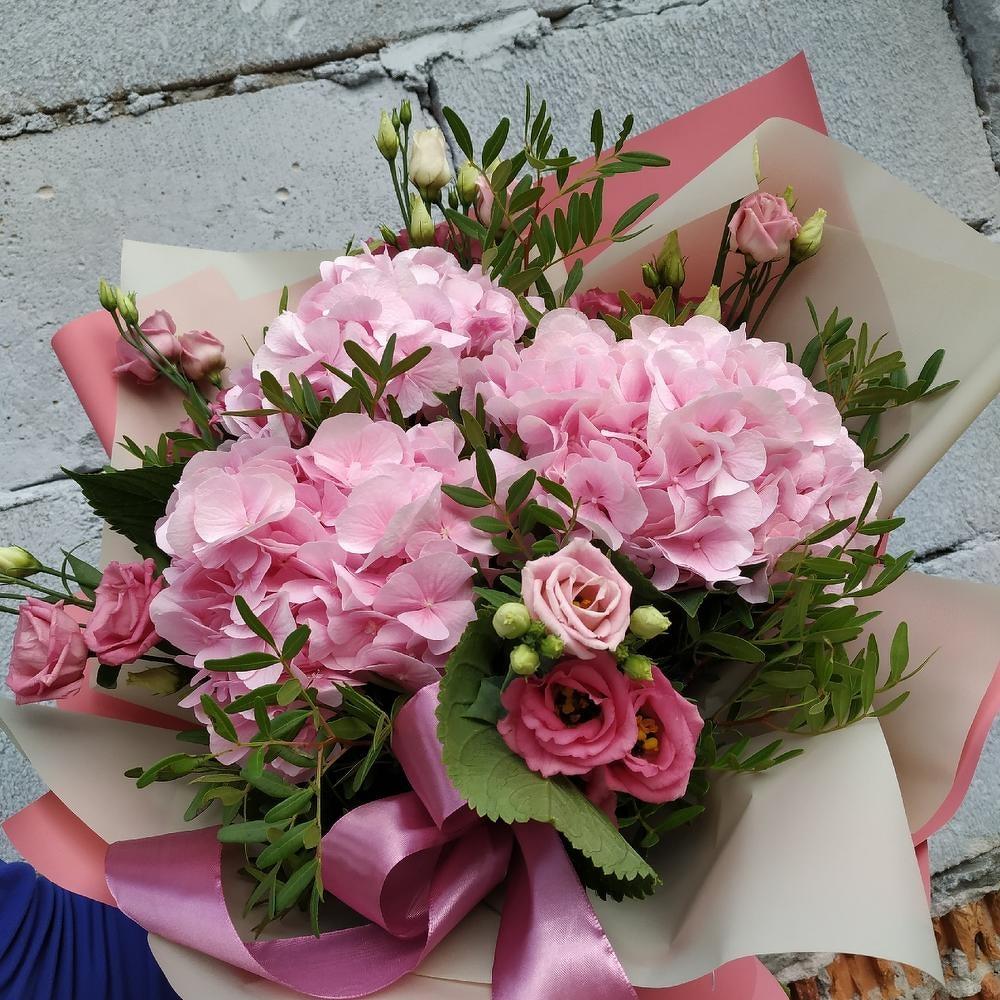Гортензия розовая – 3 шт.Лизиантус – 5 шт.Фисташка – 1 шт.Упаковка дизайнерская – 1 шт.Лента атласная – 1 шт.
