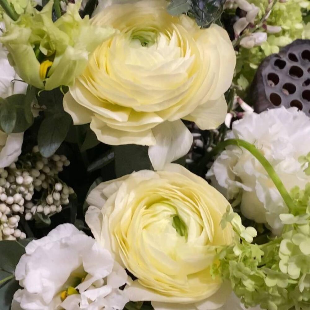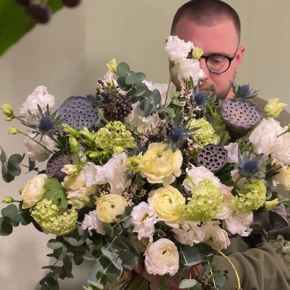 Букет с ранункулюсами, колючками и лотосами