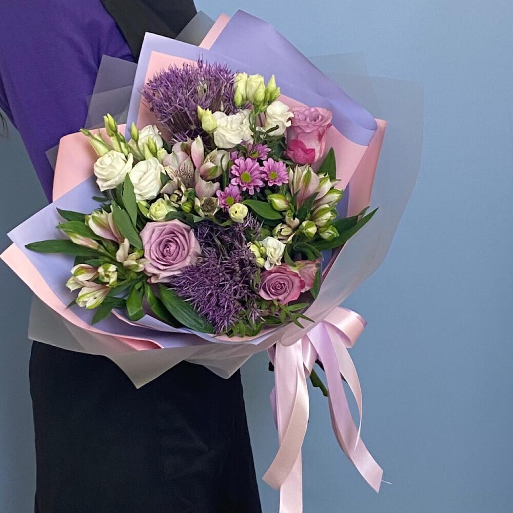 Букет с сиреневыми розами и аллиумом