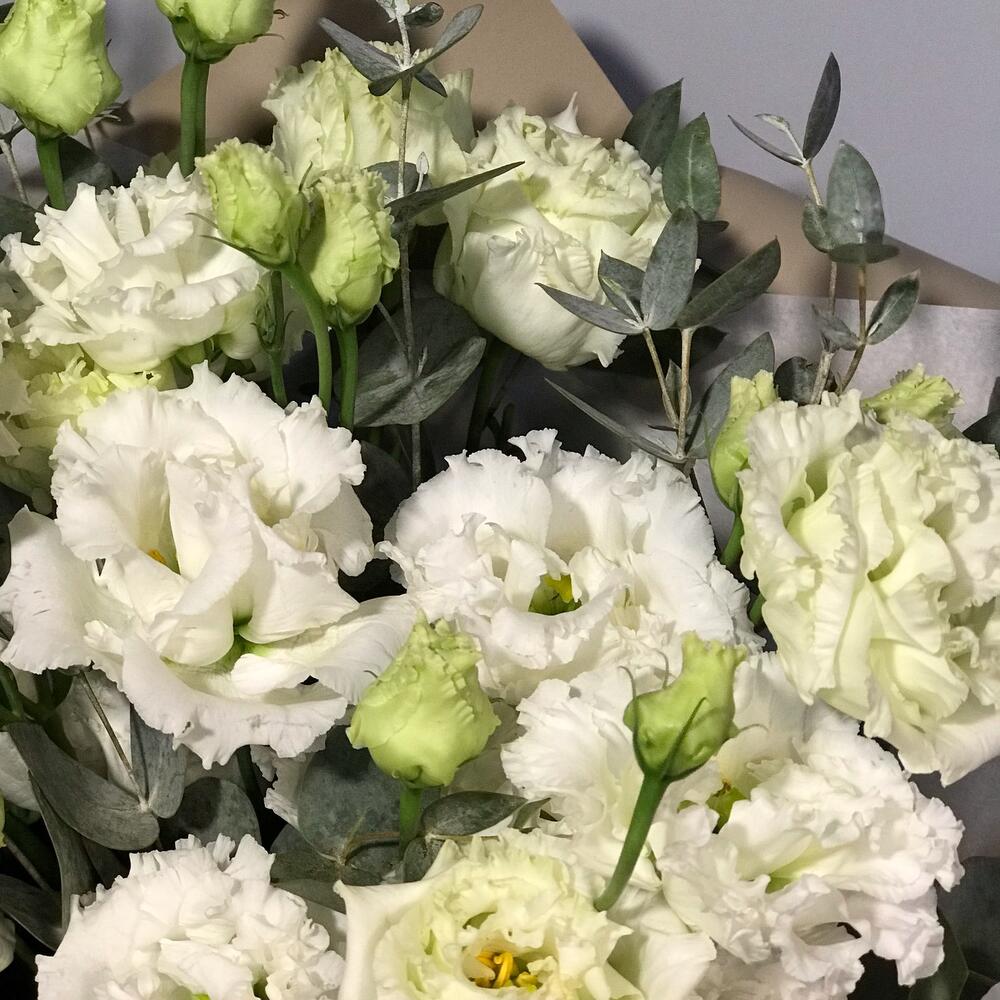 Лизиантус – 7 шт.Упаковка дизайнерская – 1 шт.эвкалипт цинерея пучок – 1 шт.