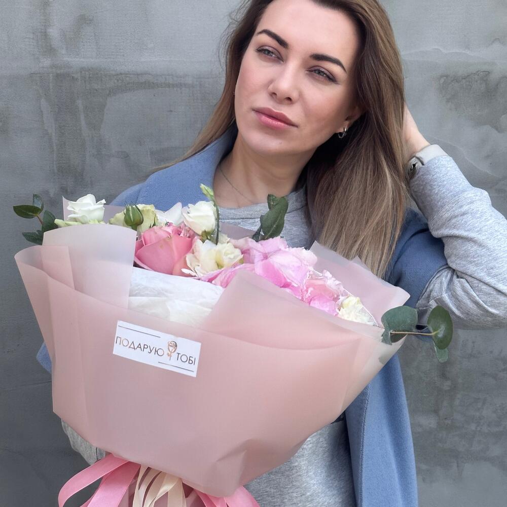 эустома белая – 2 шт. гортензія – 1 шт. евкаліпт – 1 шт. фрезія – 3 шт. троянда рожева – 3 шт. кущова троянда – 1 шт.