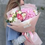Круглый букет из пионов, пионовидных роз и маттиолы