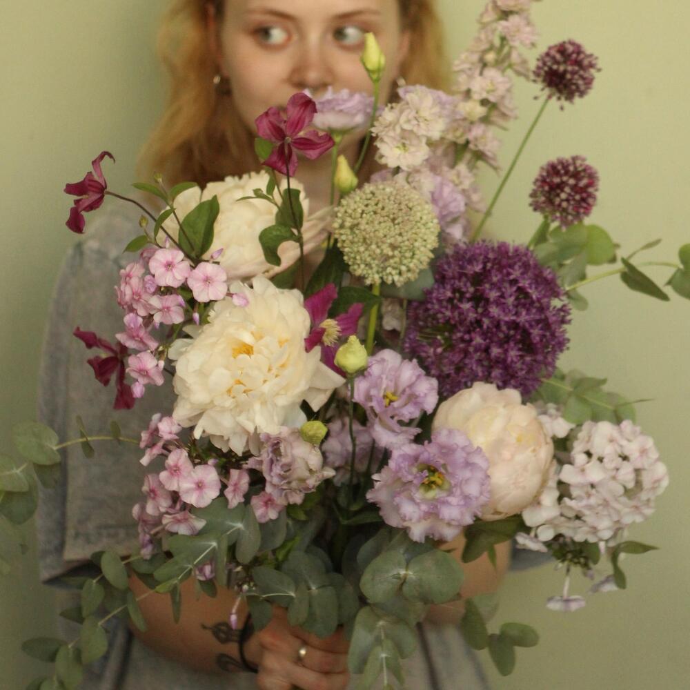 Лавандовый раф - Букет с пионами и луком