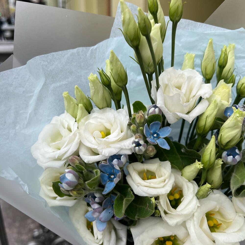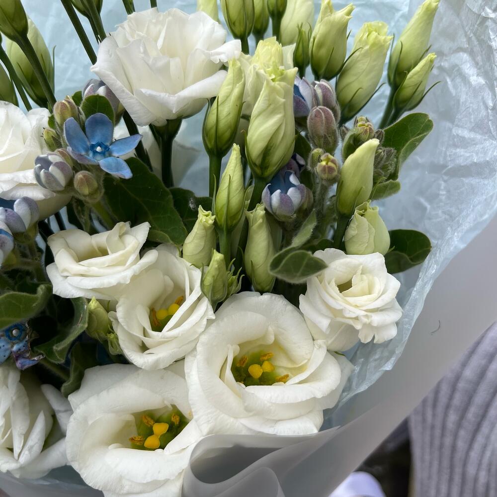 лизиантус белоснежный – 2 шт.твидия голубая – 3 шт.Упаковка корейская пленка – 1 шт.тишью нежно-голубое – 1 шт.Лента атласная белая – 1 шт.лента атласная нежно-голубая – 1 шт.