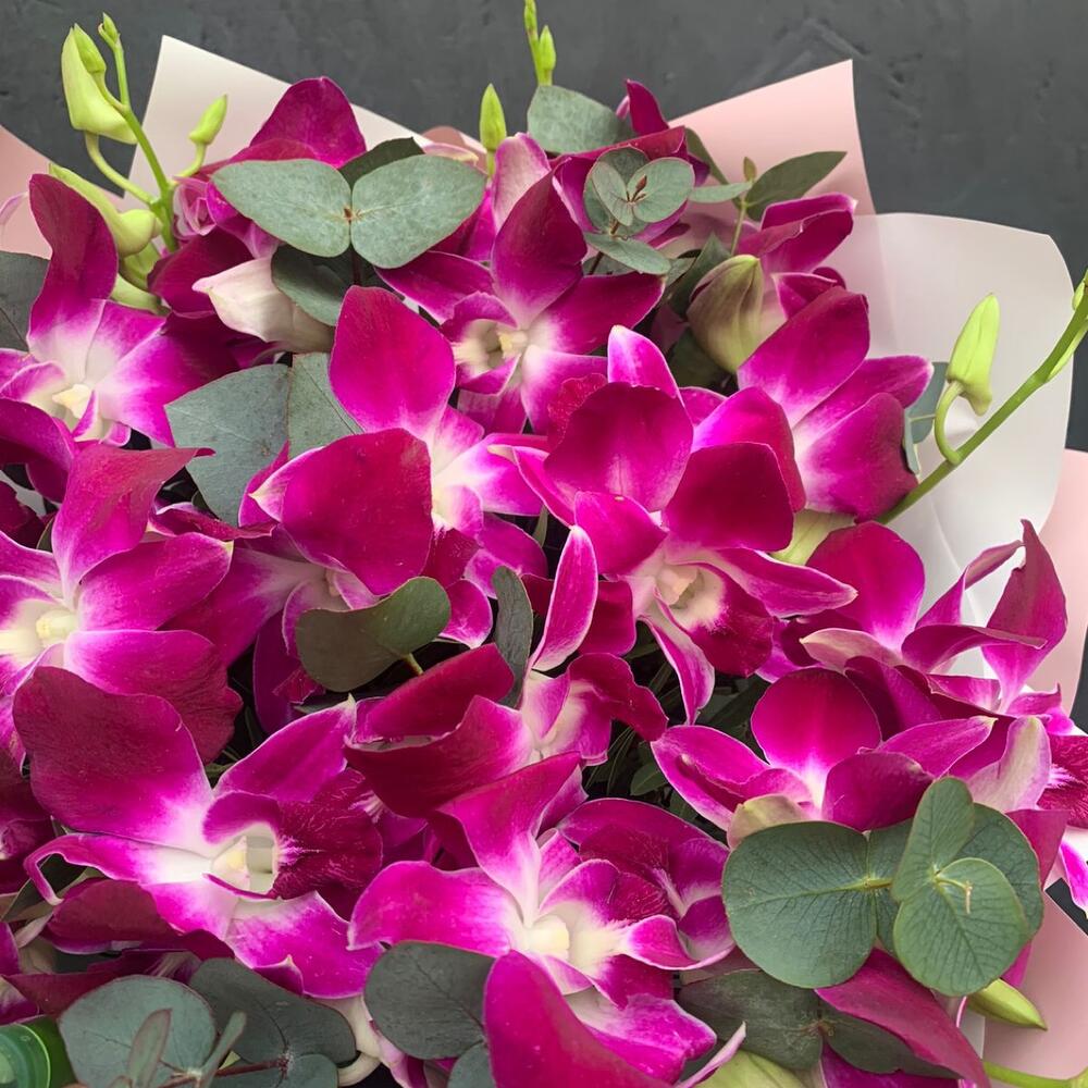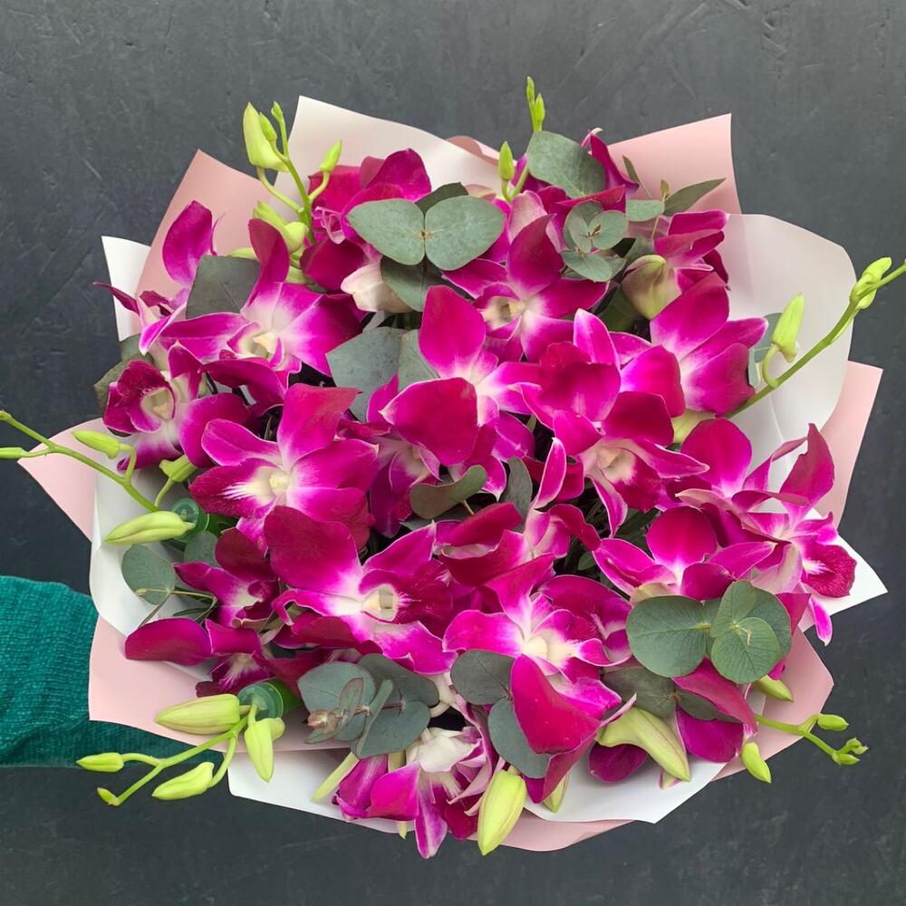 Дендробиум – 51 шт.удлинитель для орхидеи – 25 шт.Фисташка – 15 шт.Эвкалипт – 9 шт.Упаковка дизайнерская – 2 шт.Лента атласная – 1 шт.