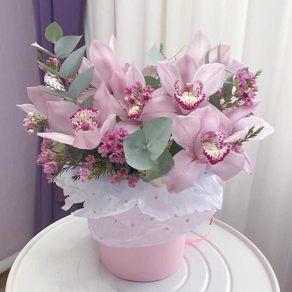 Орхидея Цимбидиум – 11 шт.Хамелациум – 3 шт.Эвкалипт – 3 шт.Лента атласная – 2 шт.