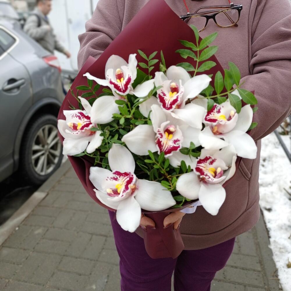 Орхидея Цимбидиум – 7 шт.Лента атласная – 1 шт.бумага дизайнерская – 1 шт.зелень декоративная – 5 шт.