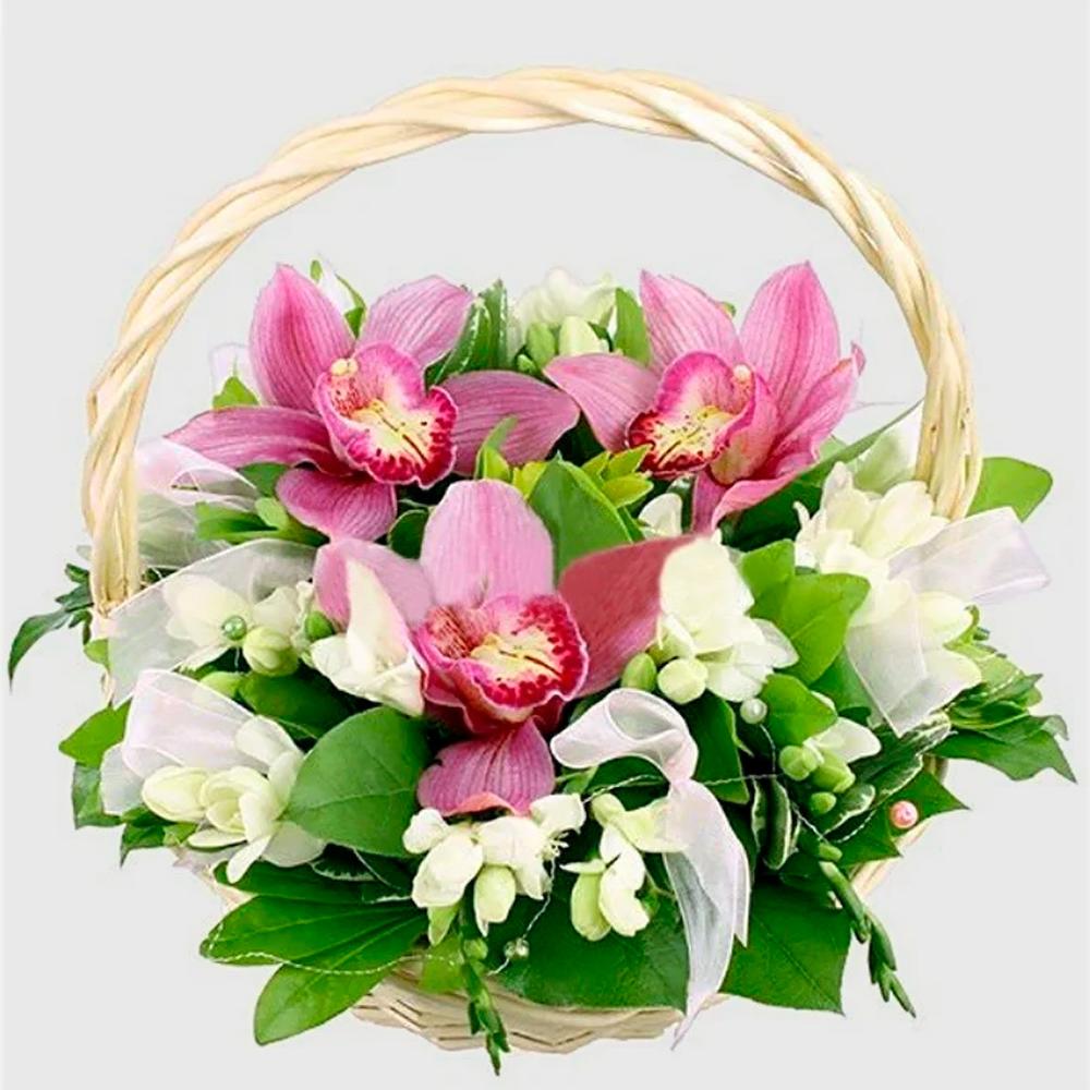 Нежная, трогательная композиция из орхидей цимбидиум и белоснежных фрезий в корзинке. Ансамбль дополнен зеленью и декоративными элементами из лент и бусин. Для самых очаровательных принцесс! Аромат фрезий настолько притягателен, что получательниц не захочет выпускать такую корзинку из рук 🙂 Подарите кучу позитивных эмоций дорогому человеку!