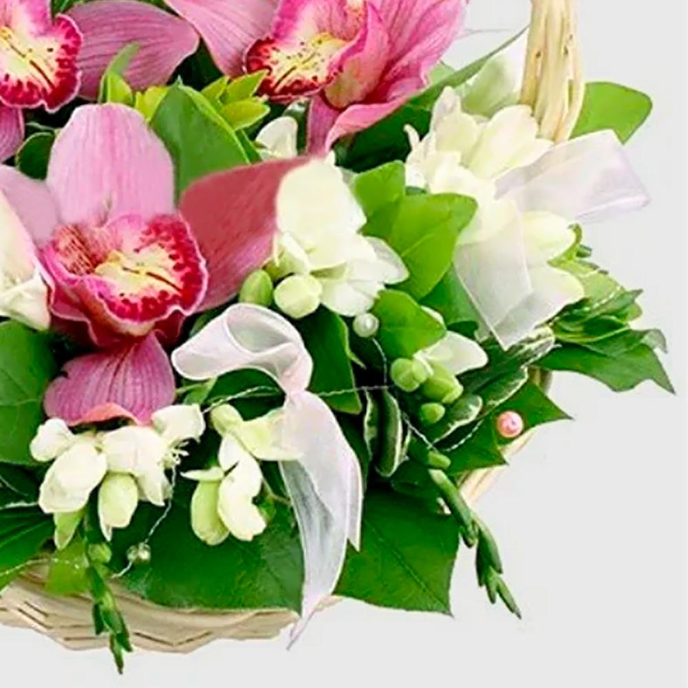 Орхидея цимбидиум бутон – 3 шт.Фрезия – 10 шт.Зелень – 10 шт.Декор флористический – 7 шт.Корзина – 1 шт.Пиафлор (оазис) – 2 шт.