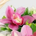 Букет из эустомы, гвоздики, цимбидиума, роз и альстромерии в дизайнерской упаковке "Белая сакура"