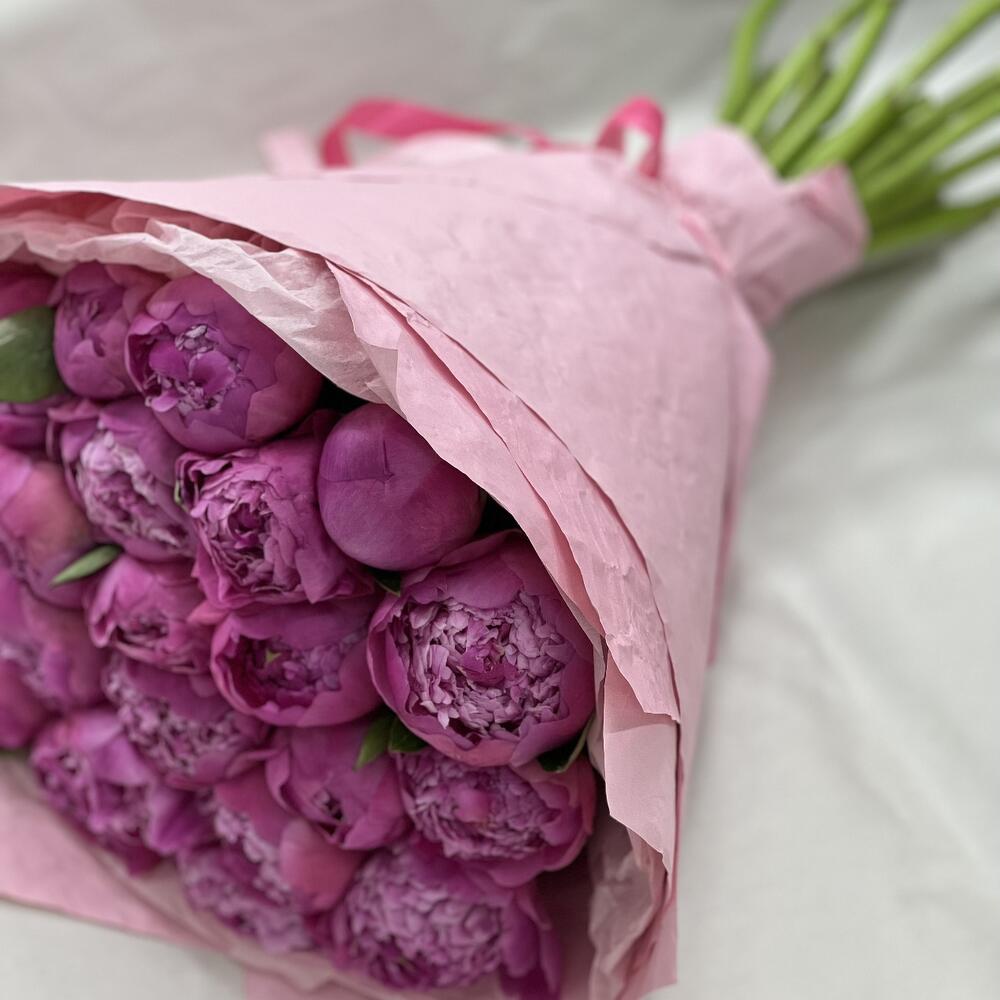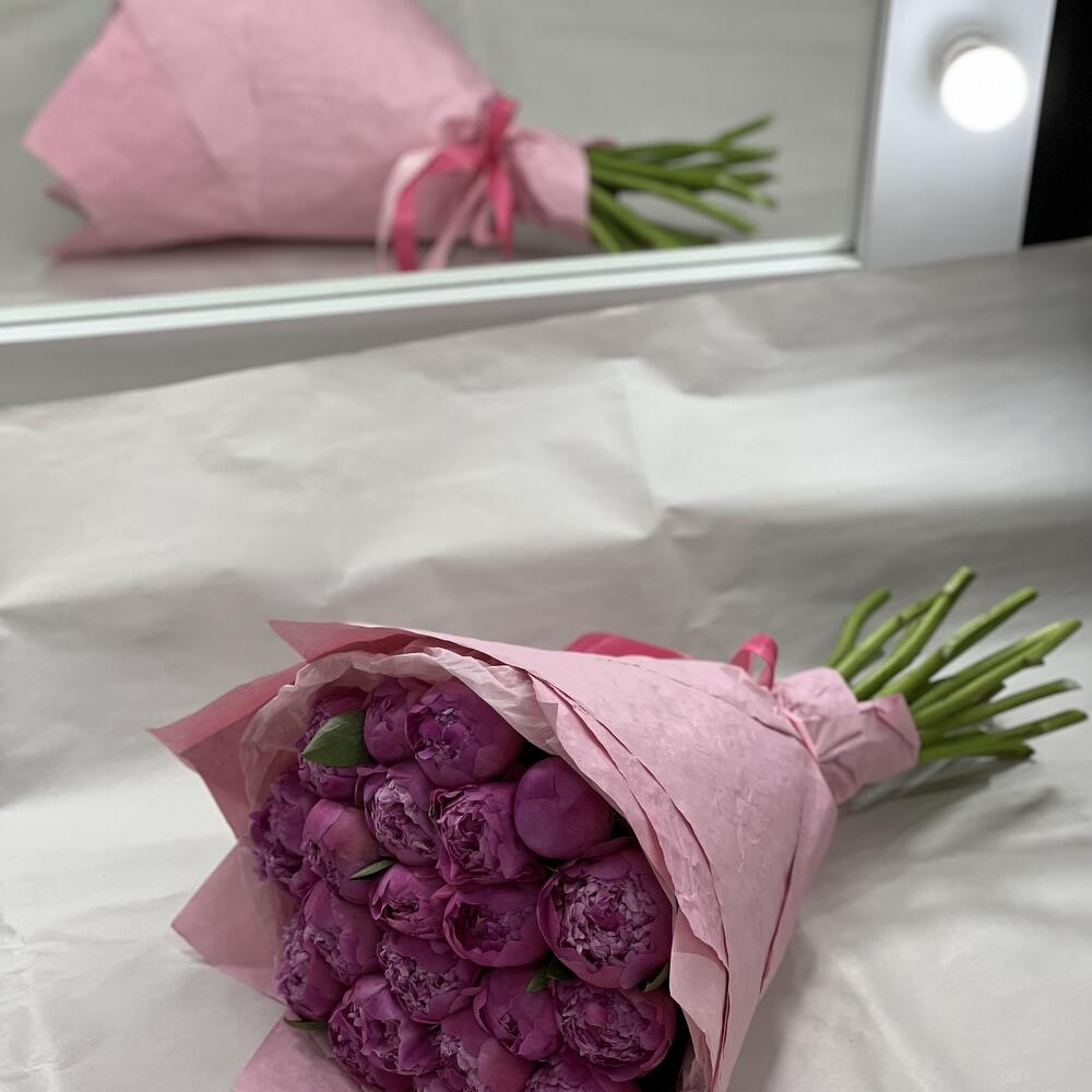 Пион – 23 шт.Дизайнерская упаковка – 1 шт.Атласная лента – 1 шт.открыточка – 1 шт.