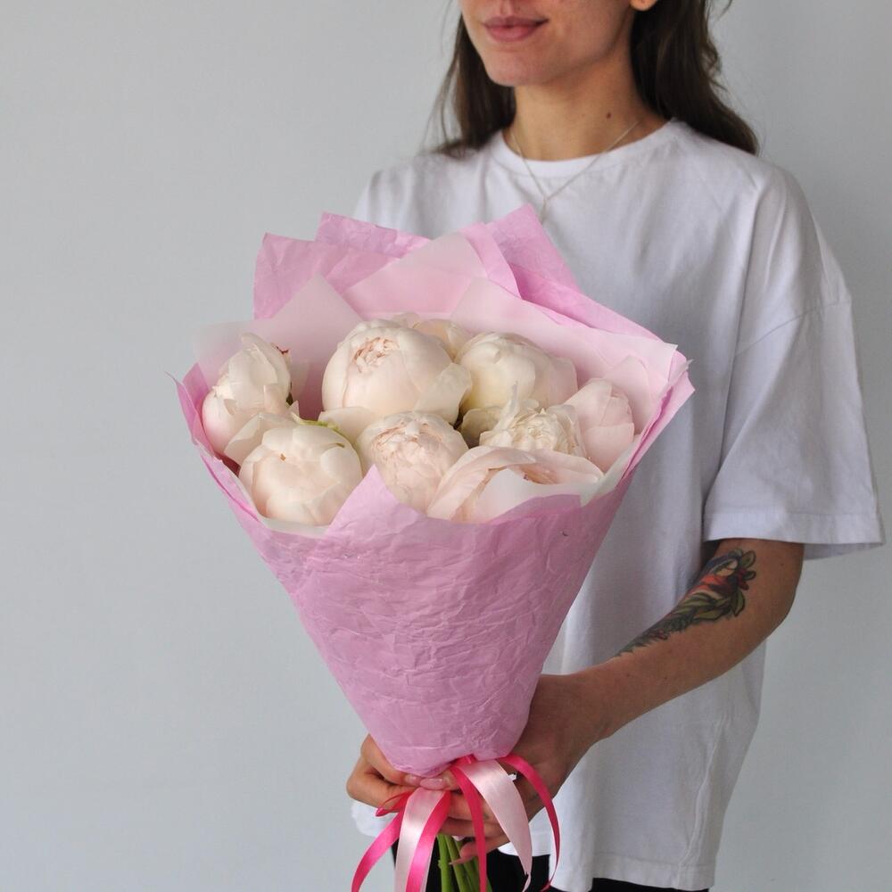 Лента атласная – 1 шт.Пион белый – 9 шт.Упаковка дизайнерская – 2 шт.
