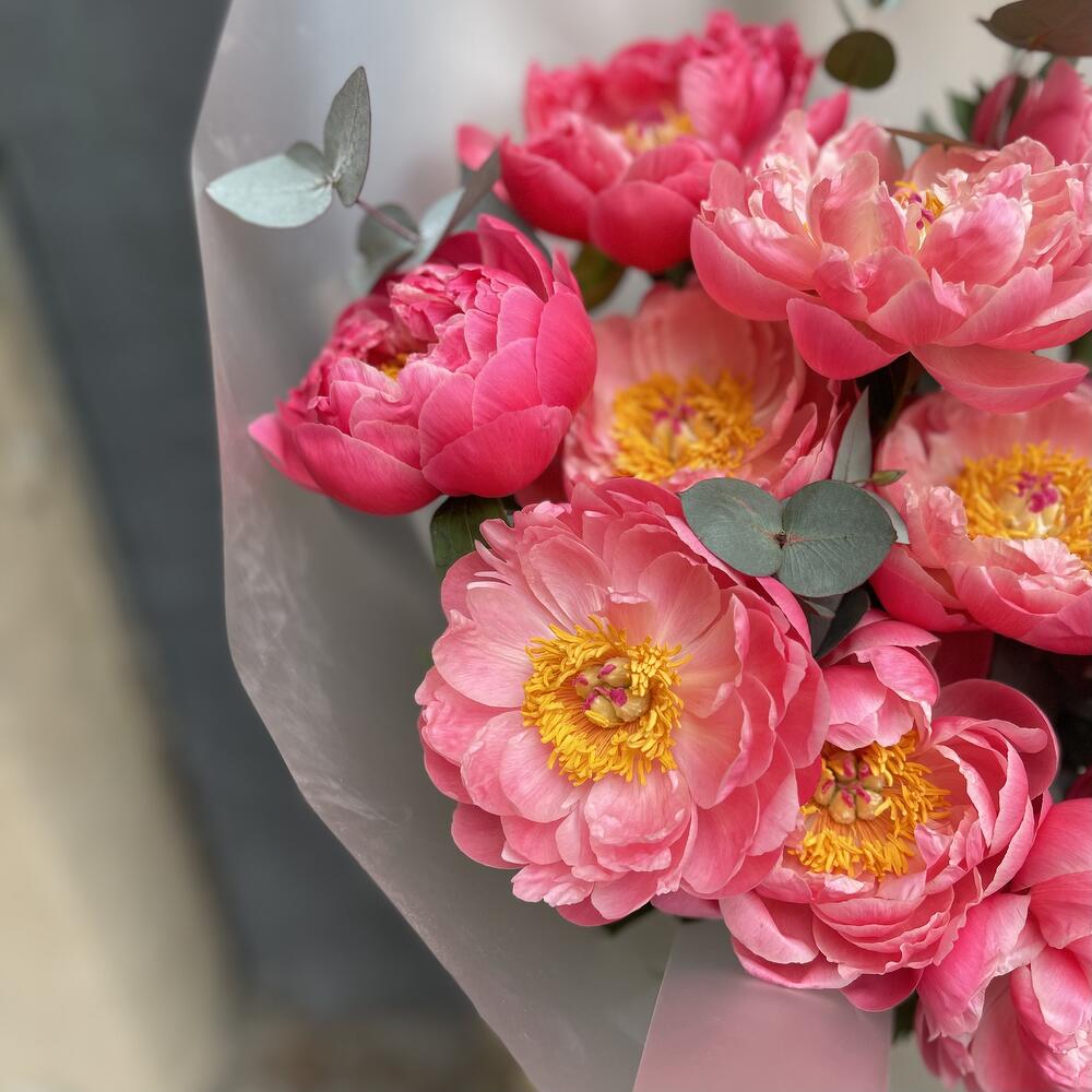Пион – 11 шт.Эвкалипт – 2 шт.Упаковка дизайнерская – 1 шт.