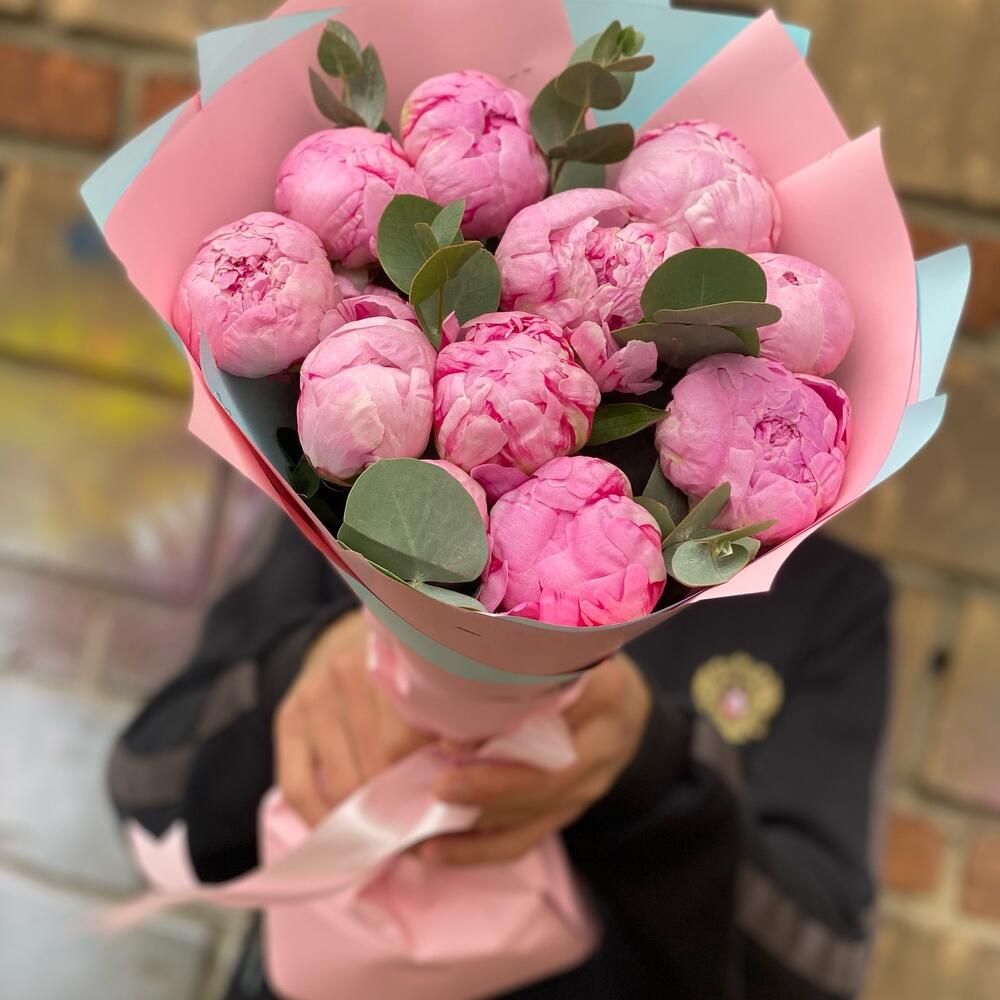 Букет из 11 пионов с эвкалиптом