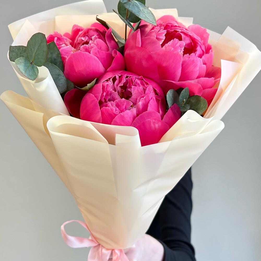 Пион – 3 шт.Эвкалипт – 1 шт.Лента атласная – 1 шт.Упаковка дизайнерская – 2 шт.