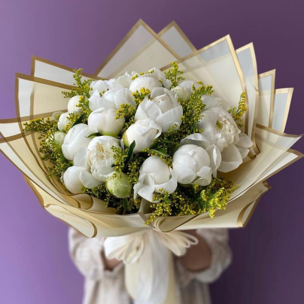 Пион белый – 21 шт.Мимоза – 16 шт.Упаковка дизайнерская – 2 шт.Лента атласная – 2 шт.Открыточка с вашими пожеланиями – 1 шт.хорошее настроение – 100 шт.инструкция по уходу за цветами – 1 шт.коробка переноска – 1 шт.Кризал – 1 шт.