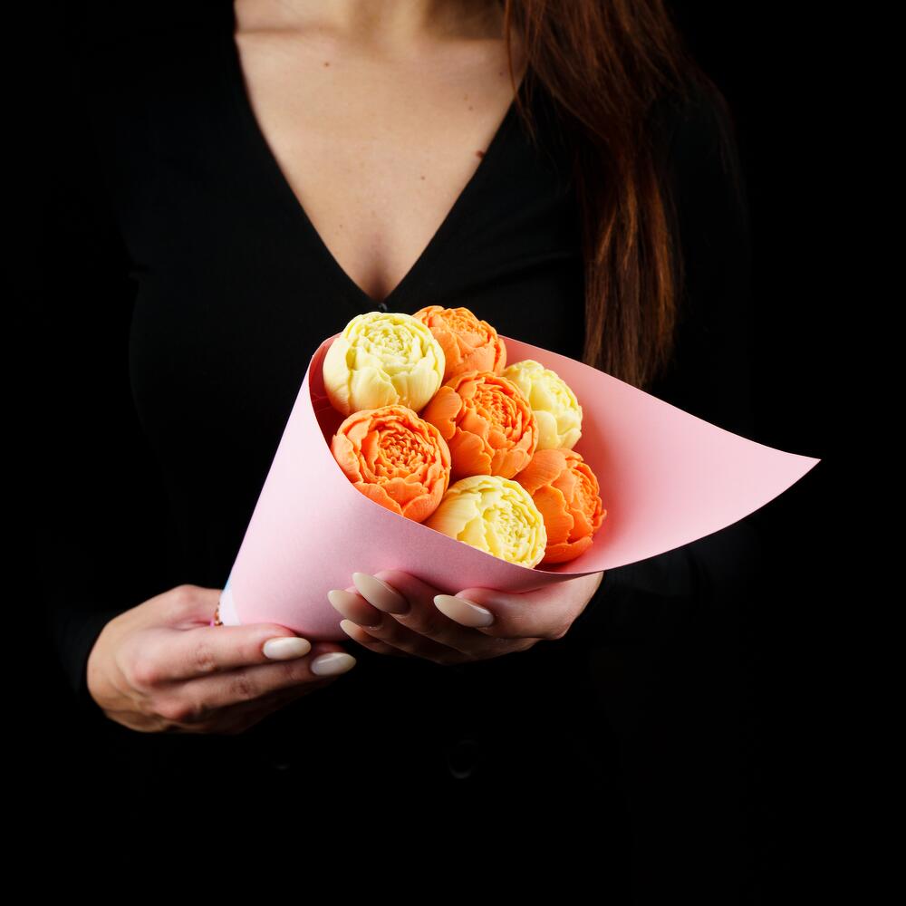 Упаковка Кулек – 1 шт.Прозрачная пленка – 1 шт.шоколадные пионы из бельгийского шоколада – 7 шт.