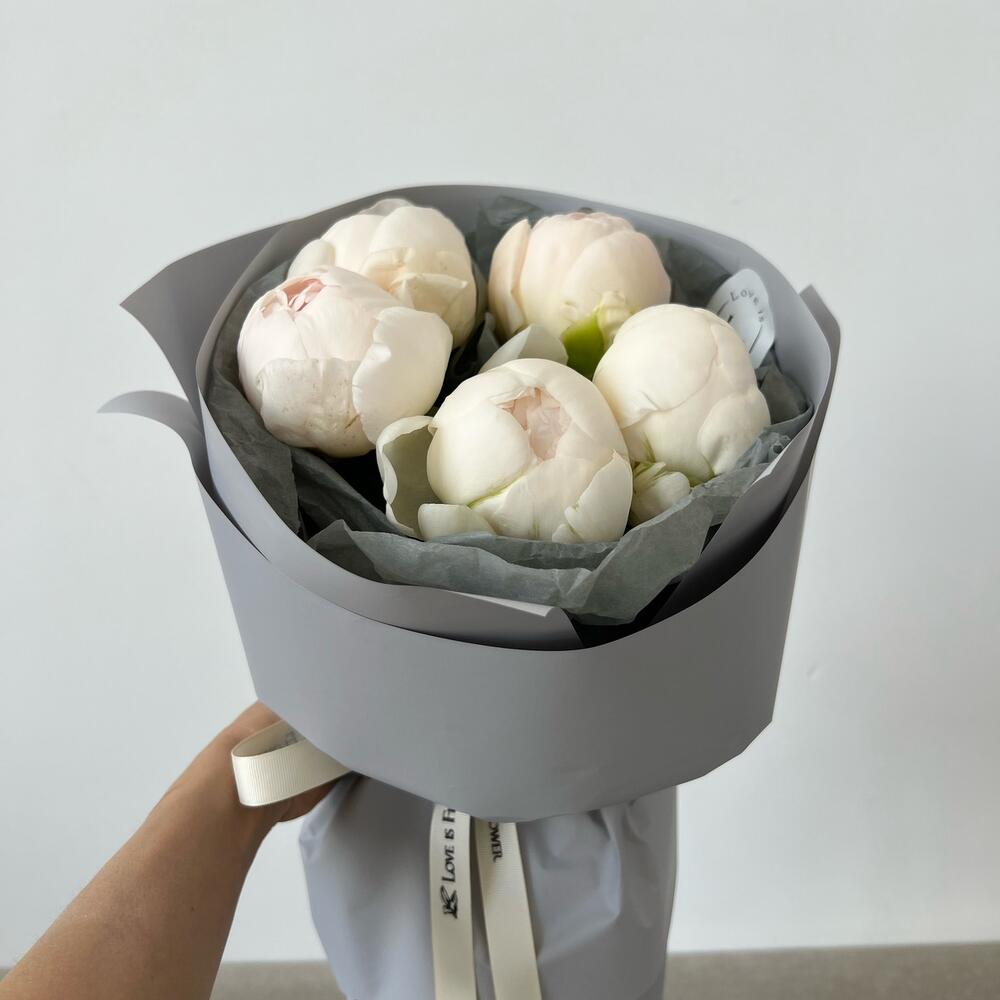 Упаковка дизайнерская – 1 шт.Лента репсовая – 1 шт.наклейка фирменная – 1 шт.пион клод тейн – 5 шт.любовь флориста (бесплатно) – 1 шт.
