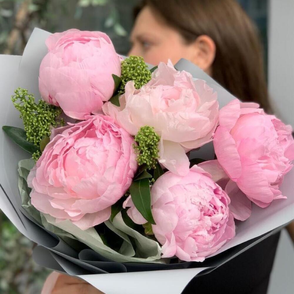 Пион розовый – 5 шт.декоративная зелень – 5 шт.Упаковка дизайнерская – 1 шт.Лента атласная – 2 шт.Открыточка с вашими пожеланиями – 1 шт.хорошее настроение – 100 шт.инструкция по уходу за цветами – 1 шт.коробка переноска – 1 шт.Кризал – 1 шт.