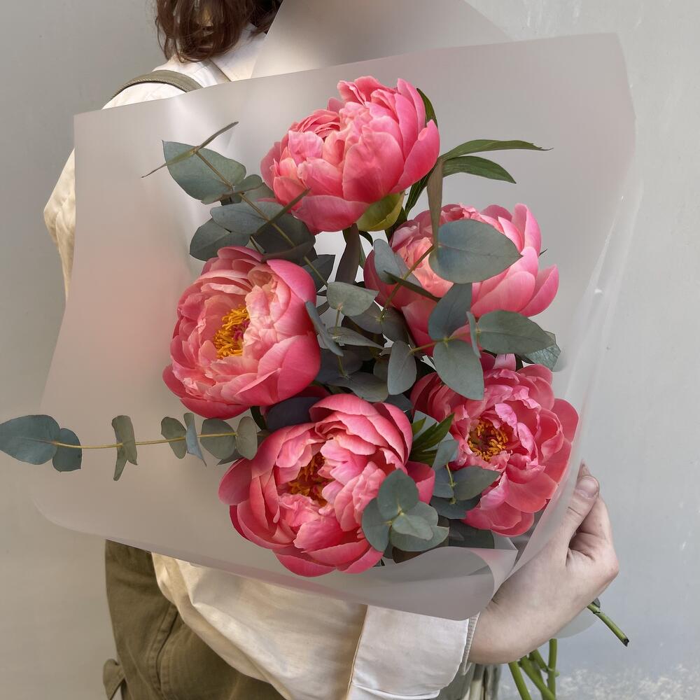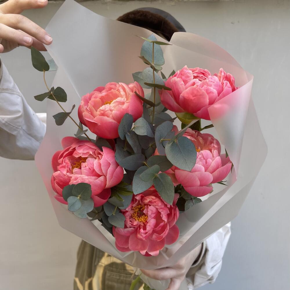 Монобукет из пионов корал шарм с эвкалиптом / 1370 id