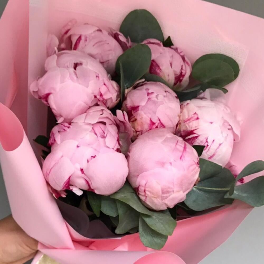 Эвкалипт – 2 шт.пионы розовые премиум – 7 шт.работа флориста – 1 шт.стильная упаковка в нашем стиле – 3 шт.