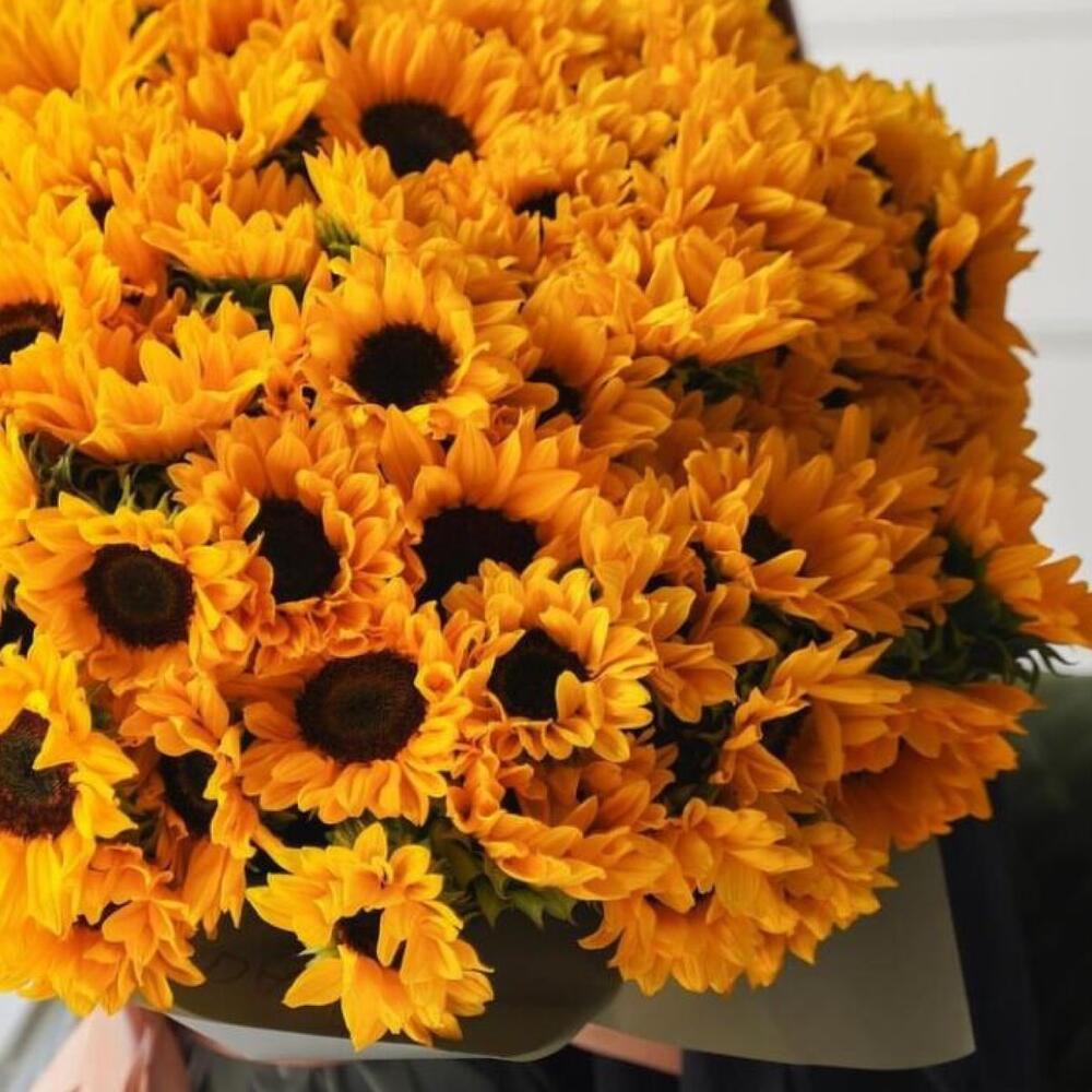 Подсолнух – 101 шт.Упаковка дизайнерская – 2 шт.Лента атласная – 2 шт.Открыточка с вашими пожеланиями – 1 шт.хорошее настроение – 100 шт.инструкция по уходу за цветами – 1 шт.коробка переноска – 1 шт.Кризал – 1 шт.