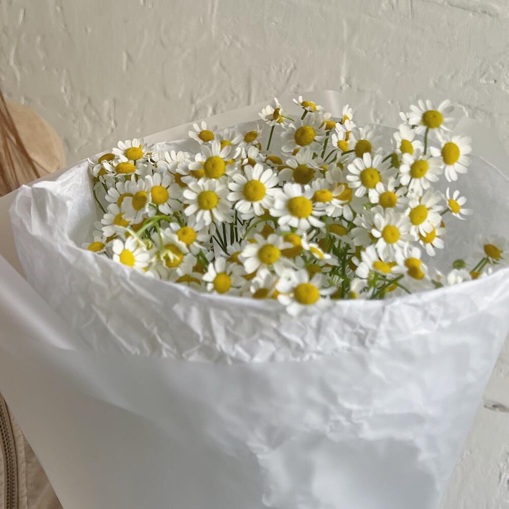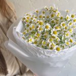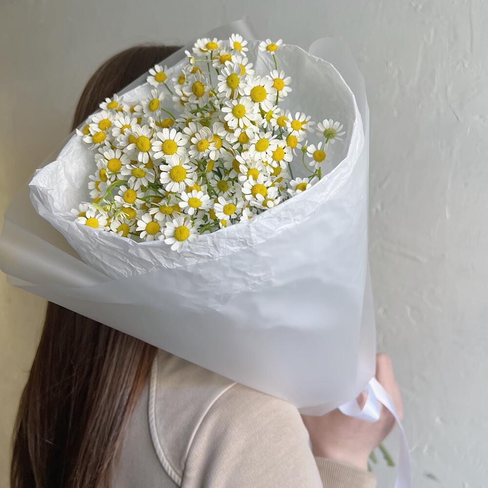 Лента атласная – 1 шт.Ромашка кустовая – 7 шт.Упаковка дизайнерская – 1 шт.Упаковка тишью – 1 шт.