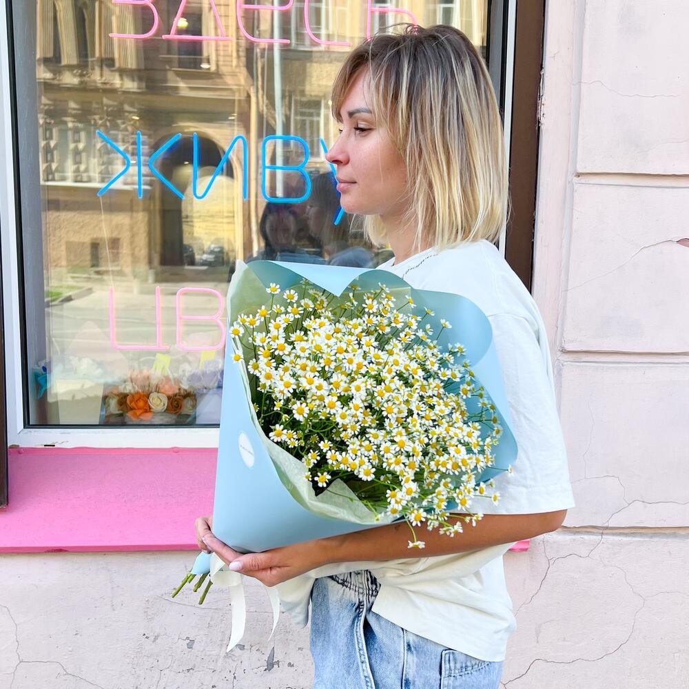 Лента атласная – 1 шт.Тишью – 2 шт.Аквапак – 1 шт.Матрикария (Ромашка Камила) – 15 шт.Корейская пленка – 3 шт.