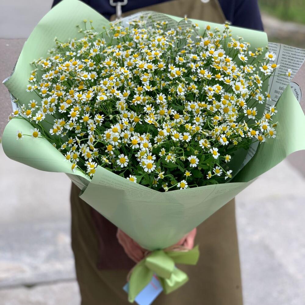 Матрикария (Ромашка Камила) – 19 шт.Упаковка дизайнерская – 1 шт.Лента атласная – 1 шт.