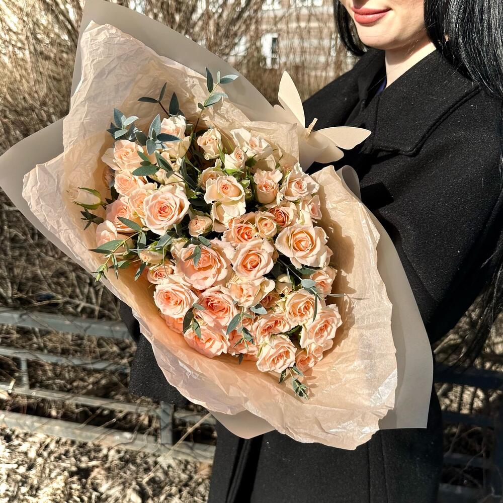 Роза кустовая – 11 шт.Эвкалипт – 3 шт.Лента атласная – 1 шт.Пленка матовая – 2 шт.Открыточка с вашими пожеланиями – 1 шт.тишью персиковое – 2 шт.