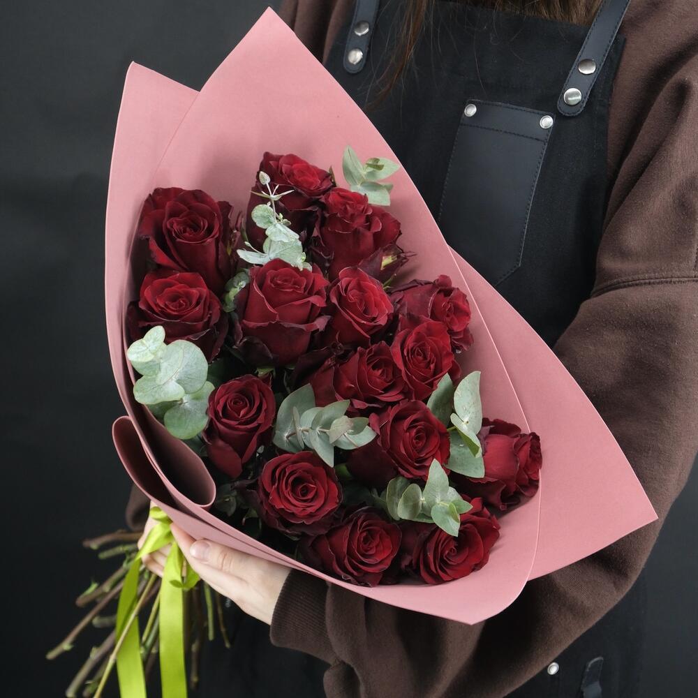 15 красных роз с веточками эвкалипта