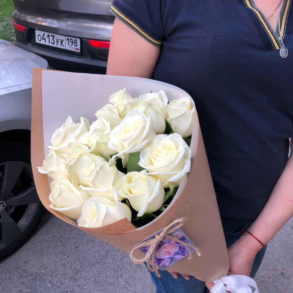 розы белые 15 штук 60 см – 15 шт.Крафт дизайнерский – 1 шт.Пленка матовая – 1 шт.Лента атласная – 1 шт.
