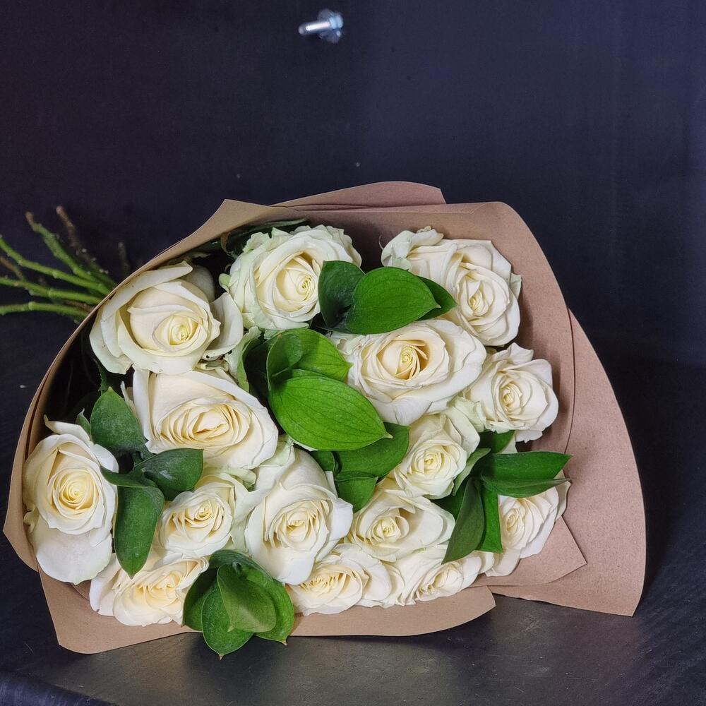 Роза аваланж россия – 15 шт.Рускус сочи – 3 шт.Крафт-упаковка – 1 шт.Лента атласная – 1 шт.