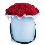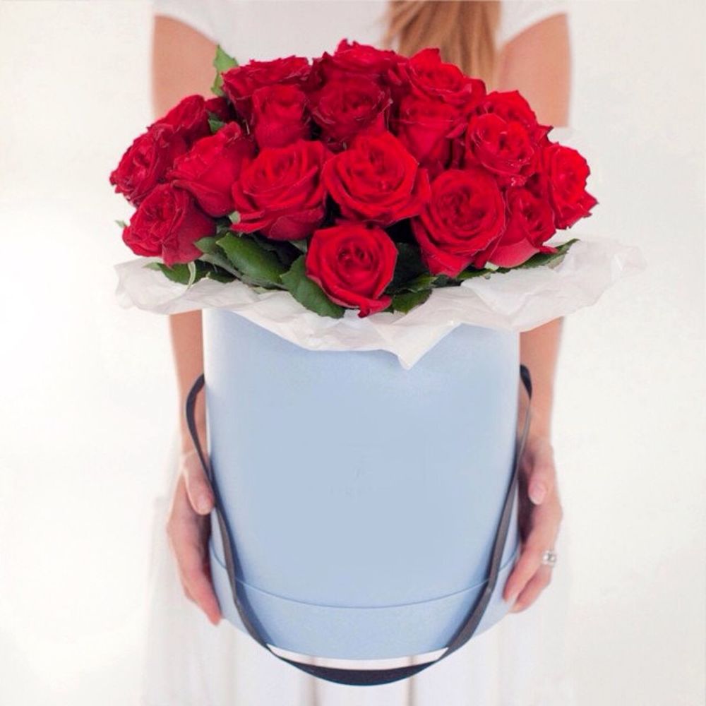 Роза красная – 25 шт.Шляпная коробка 18*18 – 1 шт.Аквабокс – 1 шт.полисилк – 1 шт.