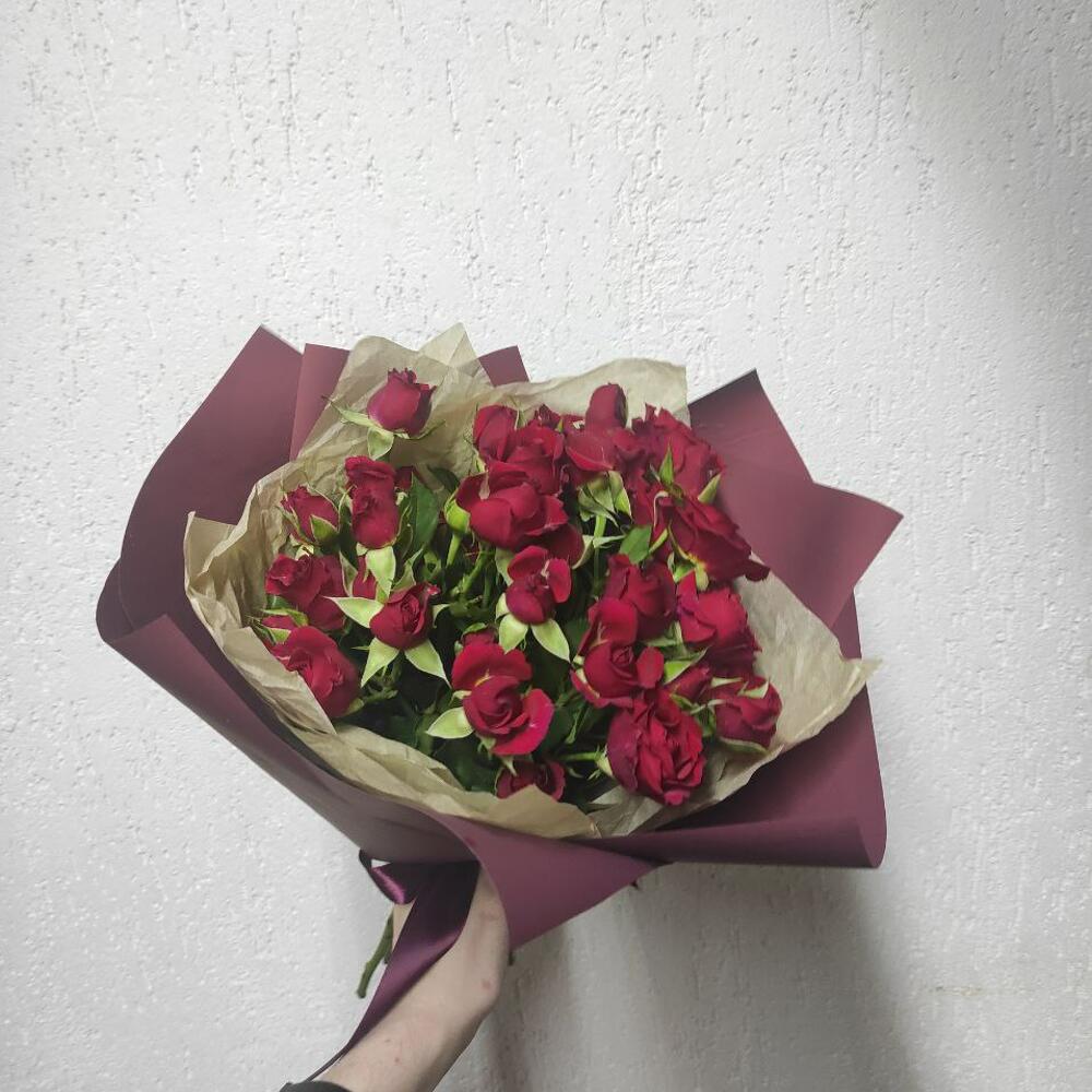 Роза кустовая красная – 9 шт.кофейная тишью – 1 шт.Корейская пленка – 2 шт.Лента атласная – 1 шт.