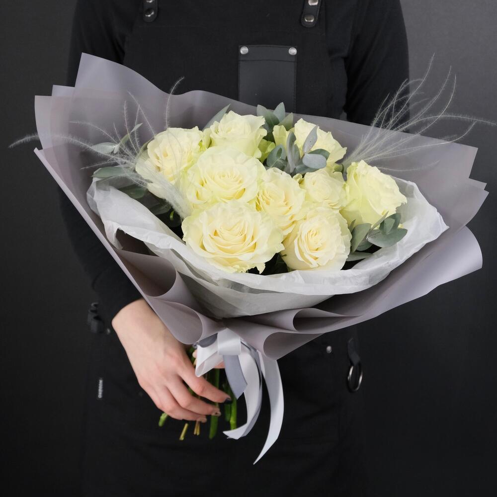 9 белых роз Мондиаль с эвкалиптом