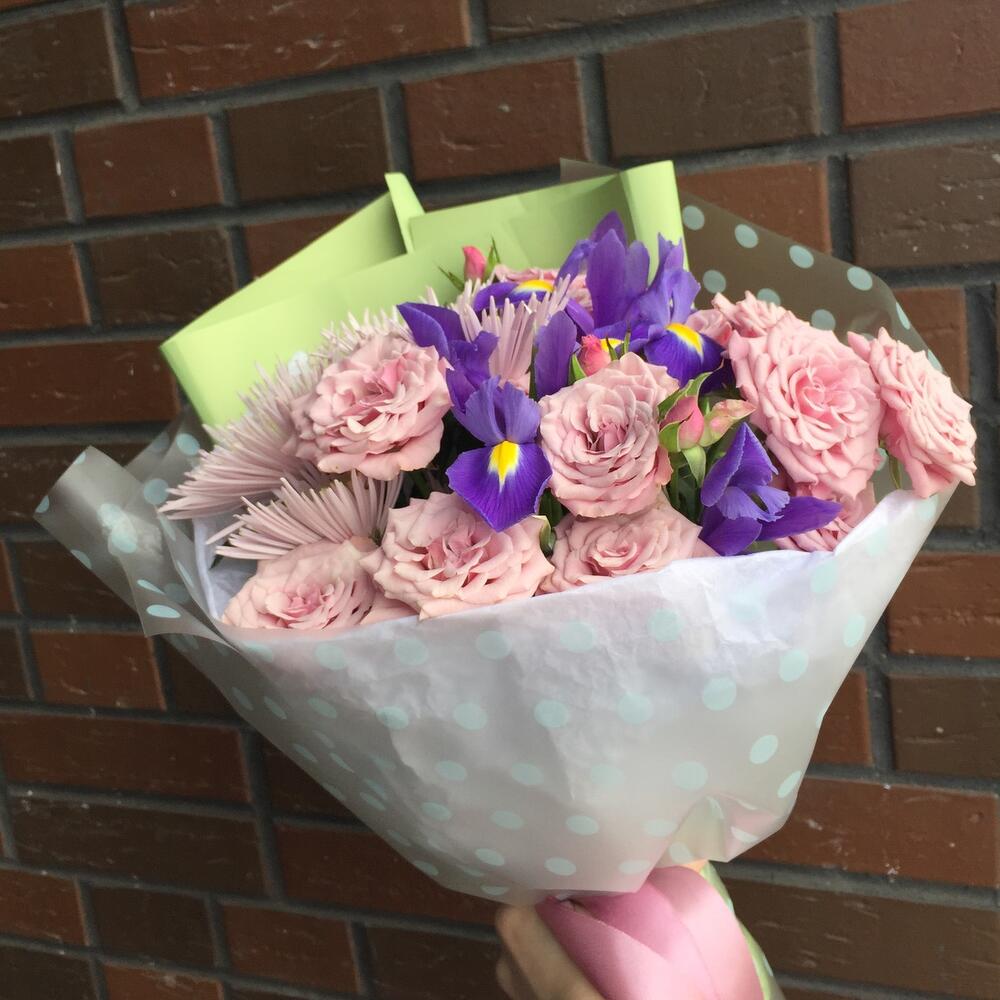 Роза кустовая – 3 шт.Хризантема кустовая – 1 шт.Ирис – 3 шт.